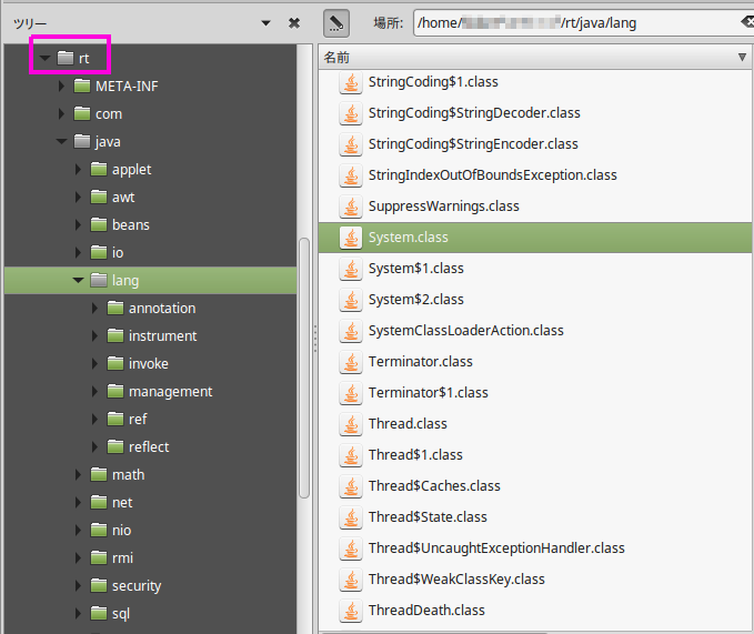 Javaクラスライブラリは、「rt.jar」に入っています。