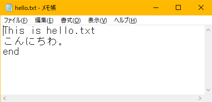 Sample05_01.java を実行したフォルダに「hello.txt」ファイルができていると思います。