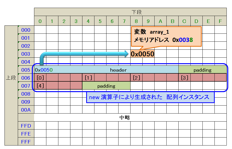 以下の図では、要素数 5の int配列に必要なメモリを、メモリアドレス 0x0050 に確保して、